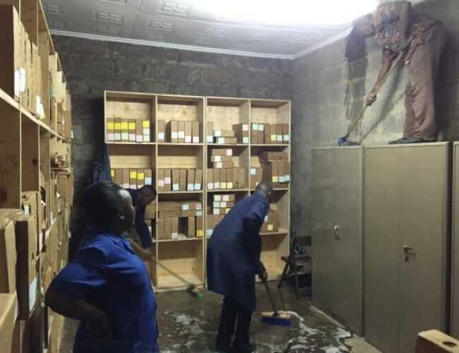 The collection is stored in very poor conditions and has not been maintained. The room is dark, hot, dusty, and damp, harbouring insects and rodents. These conditions have already destroyed some material.