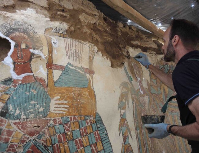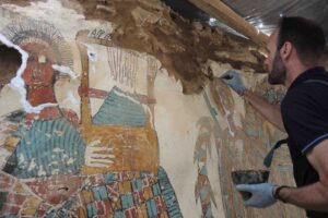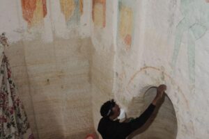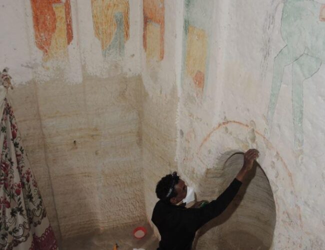 Tigray is home to some of the earliest and most important examples of ecclesiastical wall painting in Ethiopia. Surviving in both built and rock-cut churches, they are technically, stylistically, and iconographically rich and varied, but remain little known. They are executed directly onto the stone support, or onto gypsum, earthen or cloth secondary supports, using a wide range of painting materials, including expensive imported pigments. Paintings are vulnerable to geological issues, including rock falls induced by natural faults and earthquakes. Moisture ingress, salts, and macro- and micro-organisms are also major problems, exacerbated by neglect. In 2013, in collaboration with its Ethiopian partners and with the assistance of the Courtauld Institute, the EHF carried out a detailed survey of 9 painted churches, the first time this had been done in the region. Subsequently, a number of churches were identified for conservation work. In the last four years, projects have been completed at the rock-cut churches of Maryam Bahra and Abuna Daniel QorQor in the Gheralta region, both of which preserve medieval paintings. Components include not just remedial treatments such as essential stabilisation measures and careful cleaning, but also environmental monitoring and associated improvements, and efforts to promote sustainable tourism.